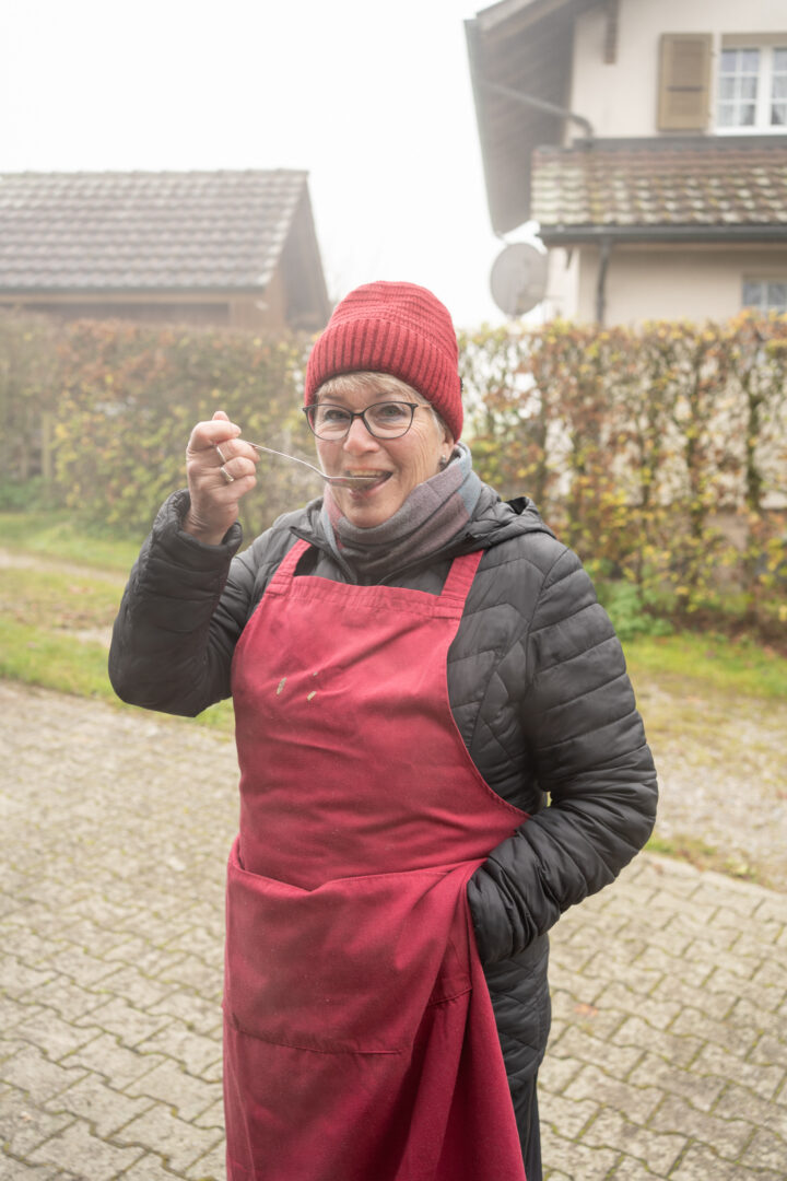 Wer lieber auf Fleisch verzichtet, erhält selbstverständlich auch eine fleischlose Variante der Suppe. Zusätzlich gibt es auf Wunsch feine Schweinswürstli als Ergänzung – solange der Vorrat reicht.